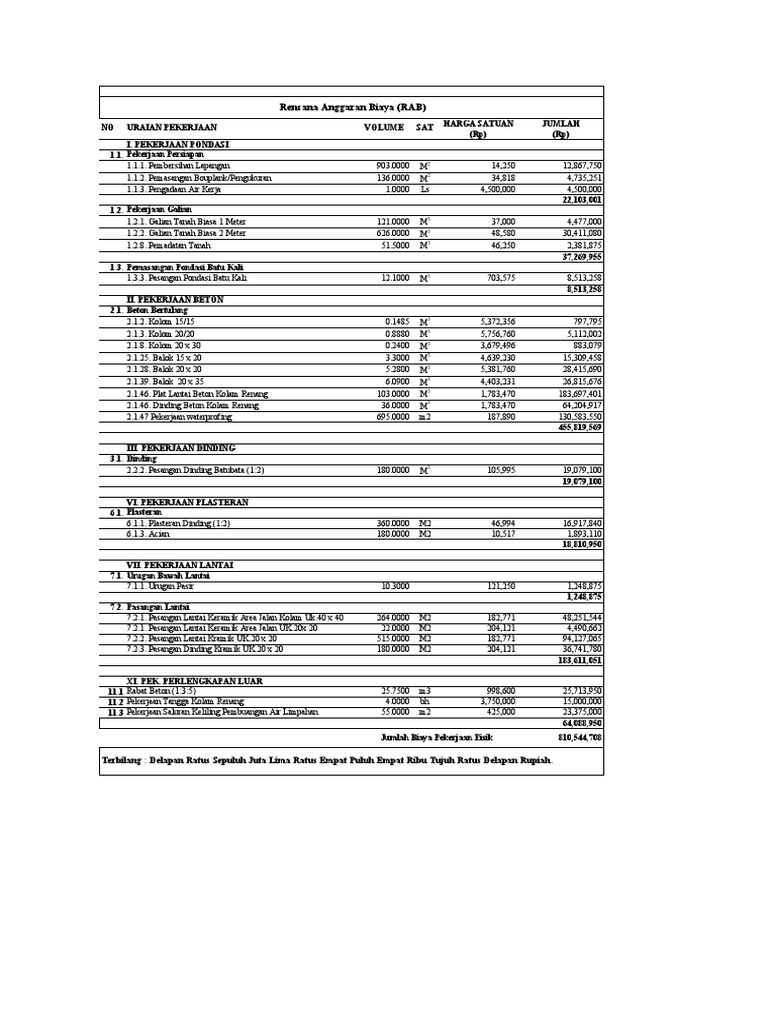 Jika ingin membangun rumah dengan lebar 6 m dan panjang 8 m maka luas rumah berikut adalah contoh perhitungan lengkap rab rumah yang menjadi referensi untuk anda. Silahkan download contoh rencana anggaran biaya (rab) dalam bentuk excel klik di sini. Perencanaan struktur gedung kantor dan struktur gedung kantor dan rencana anggaran biaya ( rab ) tugas… Download contoh rab penyelenggaraan menurut kami selain info mengenai contoh usaha bumdes yang menguntungkan, dokumen administrasi contoh pembukuan keuangan bumdes dan laporan keuangan bumdes dalam bentuk format. Download contoh file rab dan desain jembatan lengkap dalam file excell dan autocad.
